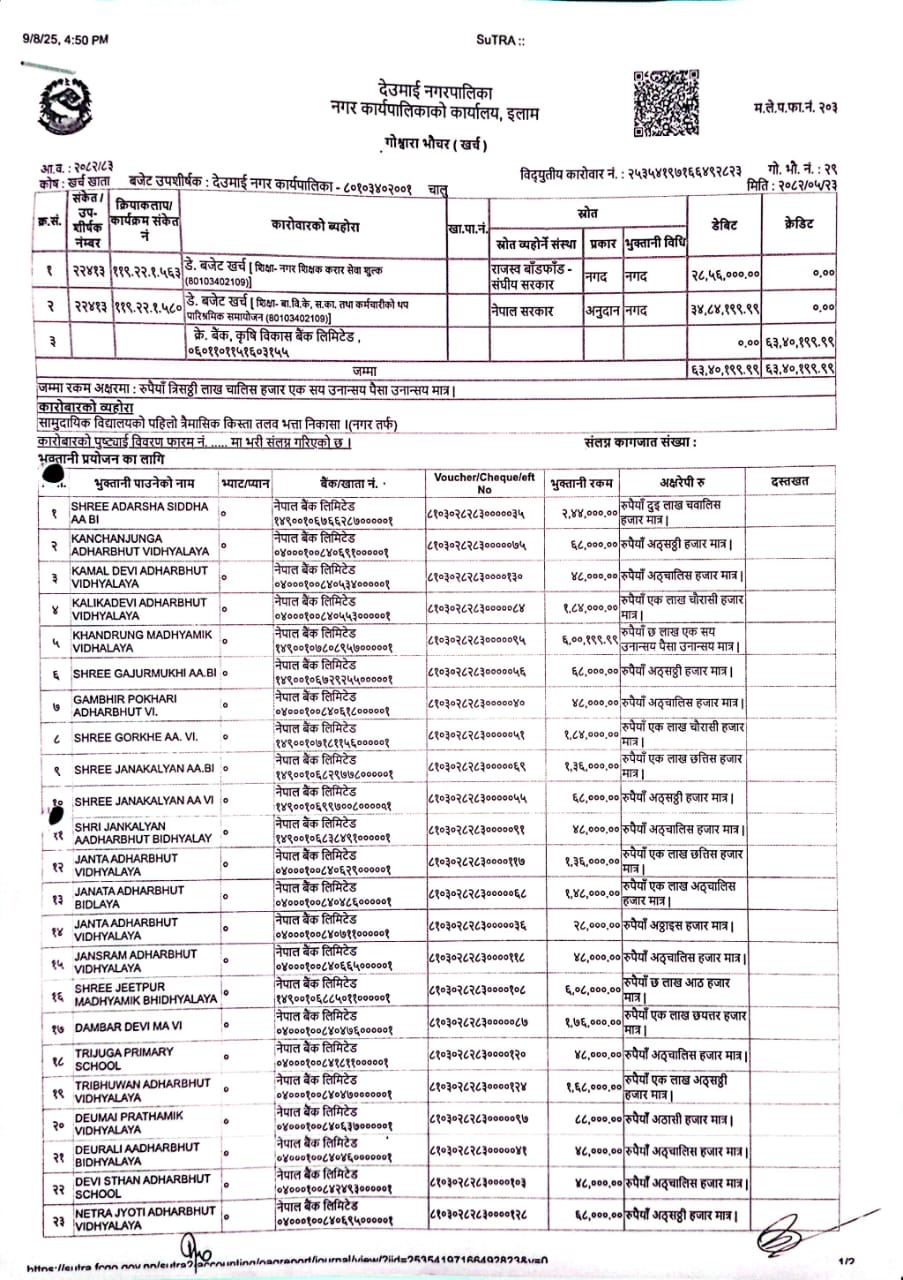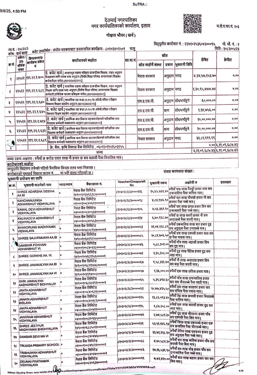 देउमाई नगरपालिका अन्तर्गत विभिन्न सामुदायिक विध्यालयका आर्थिक बर्ष २०८२-८३को प्रथम किस्ता तलबभत्ता निकासा विवरण ।
